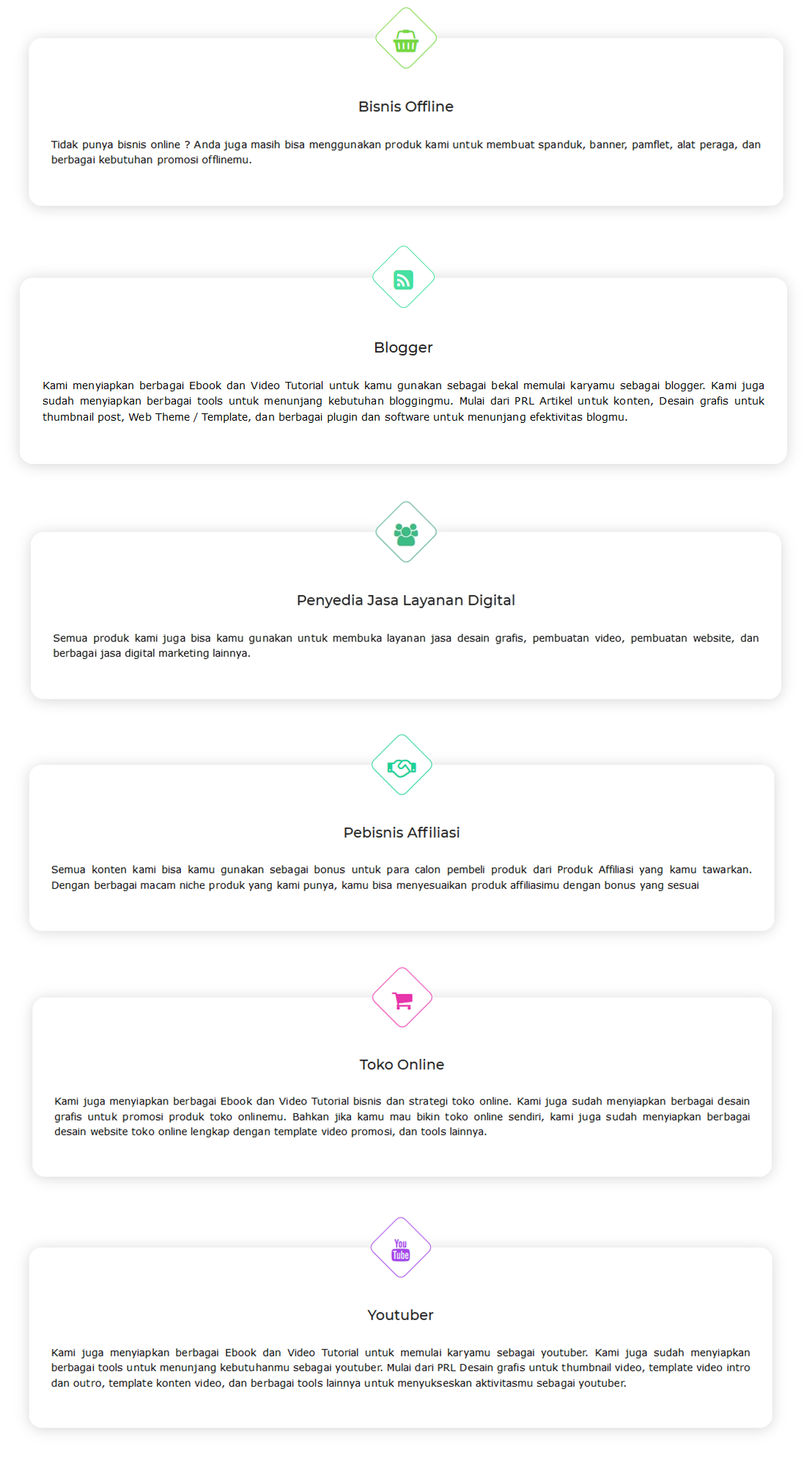 Kamu akan mendapatkan List Produk Terbaru di halaman member Area. Dan Semua Produk yang baru kami tambahkan GRATIS untuk Kamu gunakan, tanpa perlu merogoh kocekmu lagi. Produk yang kami update bukan produk kaleng-kaleng. - Produk Yang Beragam